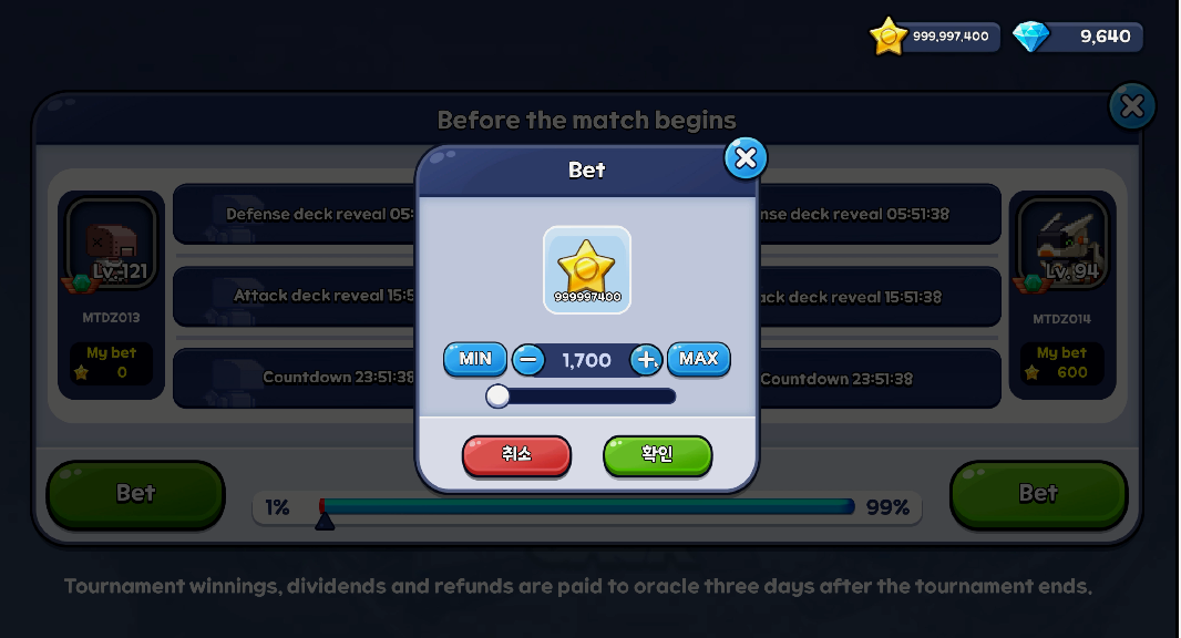 | 9/28 (일) | 결승전 | 04:00 방어덱 마감/공개 14:00 공격덱 마감/공개 21:00 히든덱 마감 21:30 베팅 마감 22:00 결승 결과 발표 & 우승자 공개 |